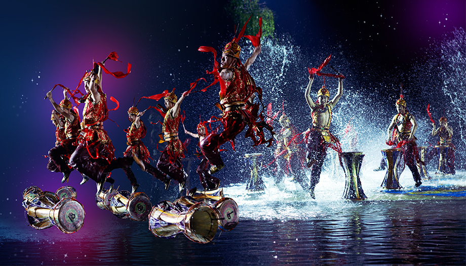 梨园内华灯溢彩,罗帐流光,缓歌慢舞,仙乐飘飘,一派歌舞升平的景象。贵妃率梨园弟子在芙蓉花中翩翩起舞,众舞女广袖舒展,云肩绚丽,唐明皇与杨贵妃乐舞合欢,含情凝睇,沉浸在情海中,共浴在爱河里。